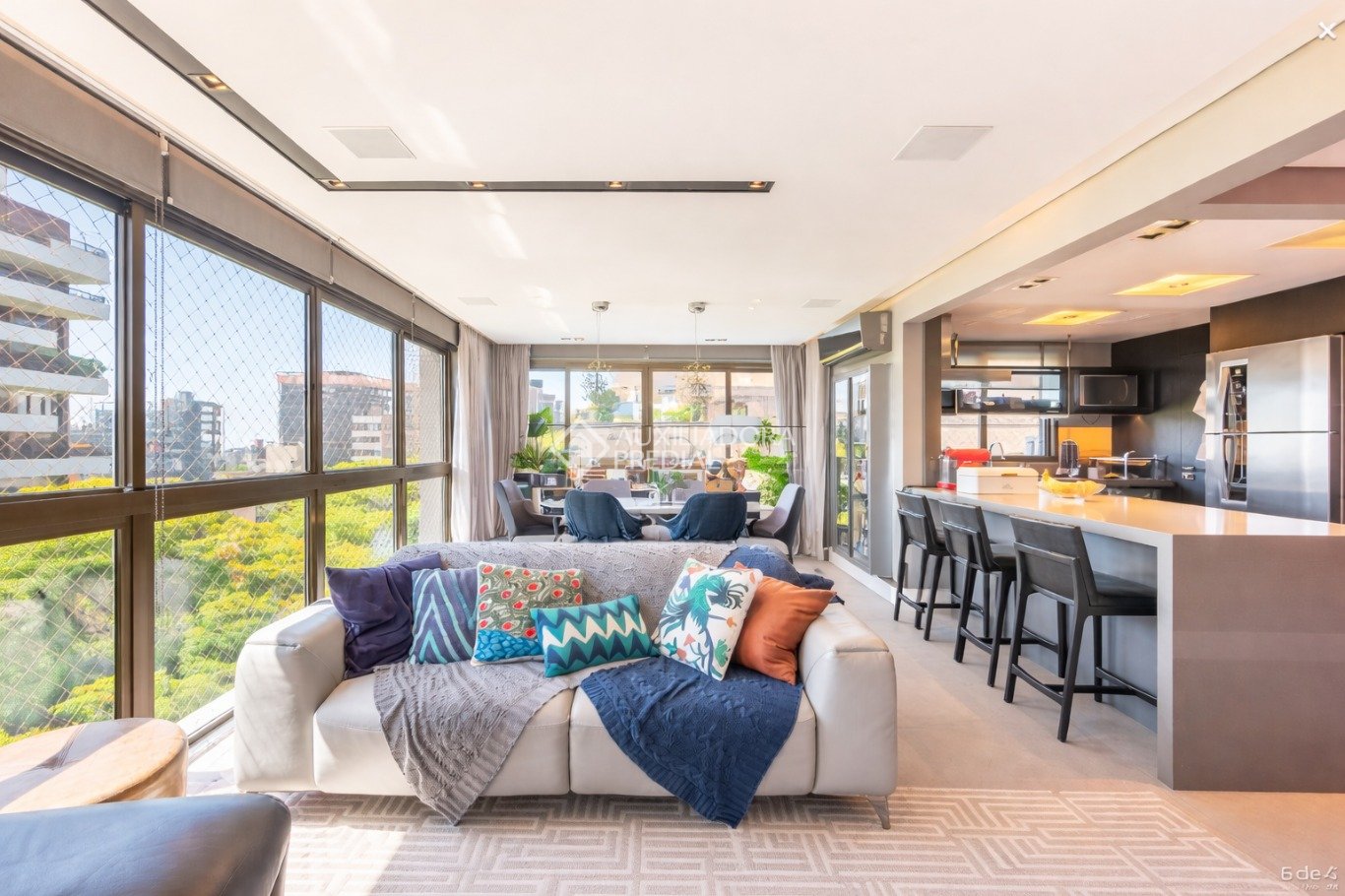 Living amplo com janelas piso-teto, vista linda, sol norte, lareira, churrasqueira e lavabo.